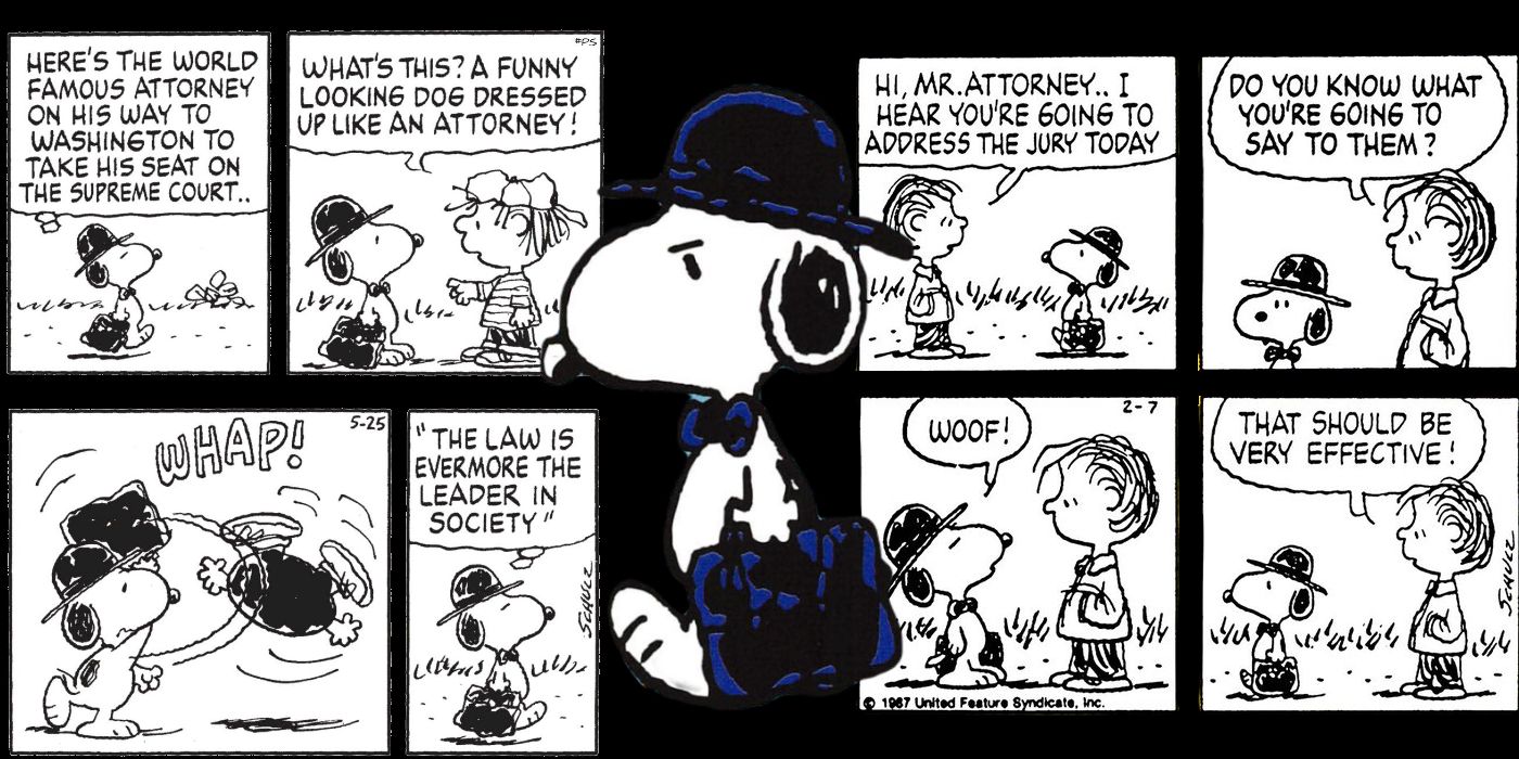 El tribunal está en sesión cuando Snoopy se presenta como el famoso abogado, uno de los personajes que le gustaba sacar regularmente. Snoopy se puso por primera vez la pajarita y el sombrero y se preparó para ir al tribunal el 12 de enero de 1972, en una historia con el intento de Peppermint Patty de eliminar el código de vestimenta de la escuela.