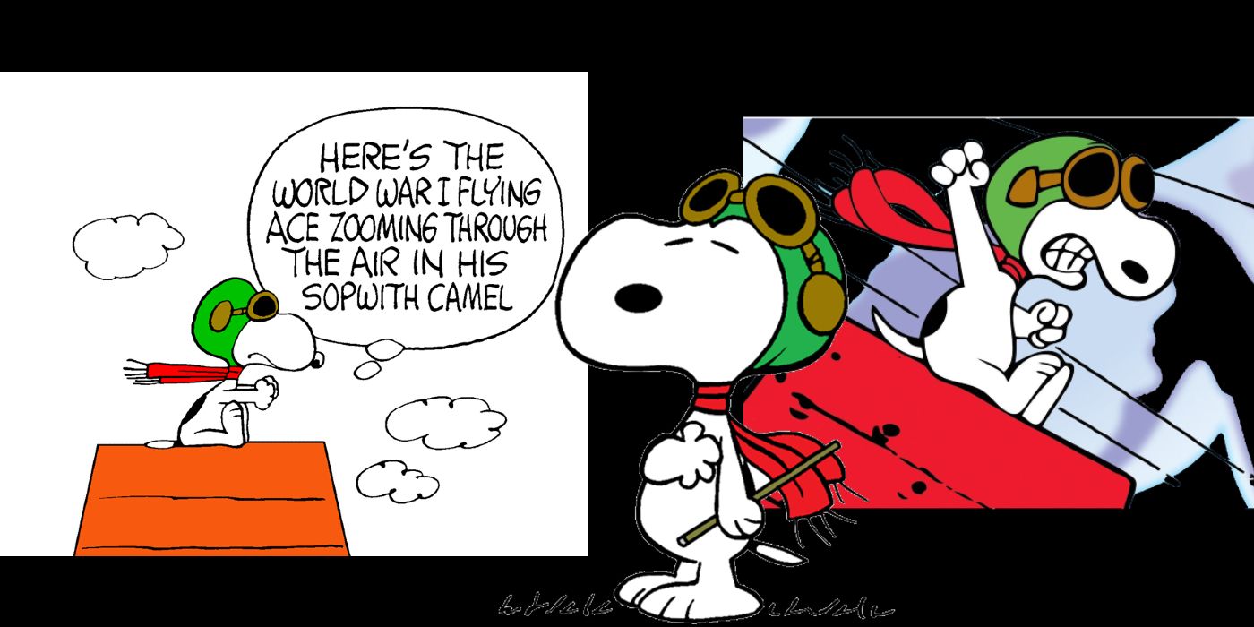 Snoopy, el as del vuelo de la Primera Guerra Mundial, en lo alto de su biplano con casa para perros estilo Sopwith Camel y luchando contra El Barrón Rojo, es con mucho la identidad alternativa más popular y querida del mejor amigo de Charlie Brown. En octubre de 1965, Snoopy se subió a la cima de su caseta de perro, listo para luchar contra su pronto archienemigo, lo que terminó cuando Linus se acerca por detrás e imita el disparo de una ametralladora.