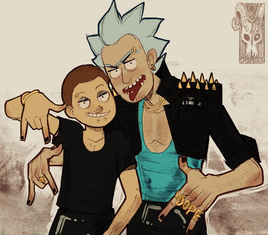 A Rick le encanta llevar a Morty de aventuras con él. Viajan a diferentes tiempos, dimensiones y planetas. Este fanart de Smooshkin tiene a ambos adaptando el estilo de vida gótico. Y están sacudiendo esa mirada. El "DOPE" en los dedos de Rick y los piercings en toda su cara se ven magnÃficos.