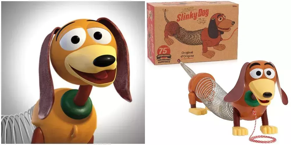 Slinky es un juguete de plástico que se parece al perro salchicha de Toy Story. Tiene una parte delantera y trasera de plástico que se conectan a través de un slinky de metal y habla con un fuerte acento sureño.