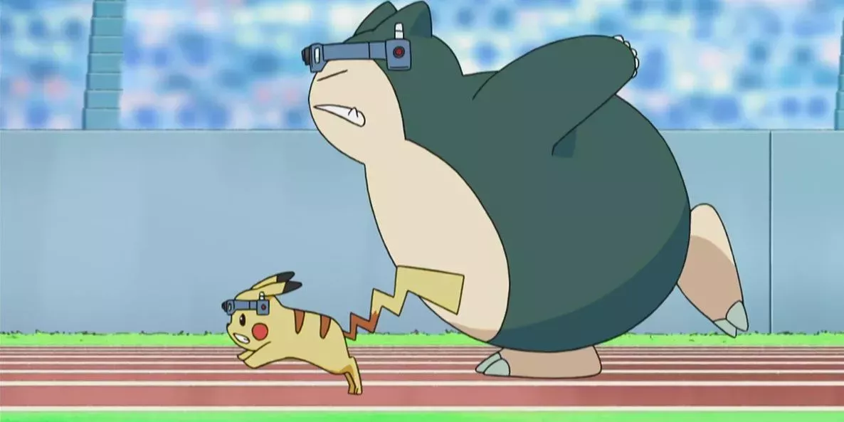 En la última prueba del Pokéatlón, el Snorlax de Daniel y el Pikachu de Ash salieron a la pista y se enfrentaron en una carrera de obstáculos. Snorlax se llevó la victoria, pero solo porque el tamaño de su barriga le ayudó a sobresalir más y a cruzar la línea de meta en primer lugar.