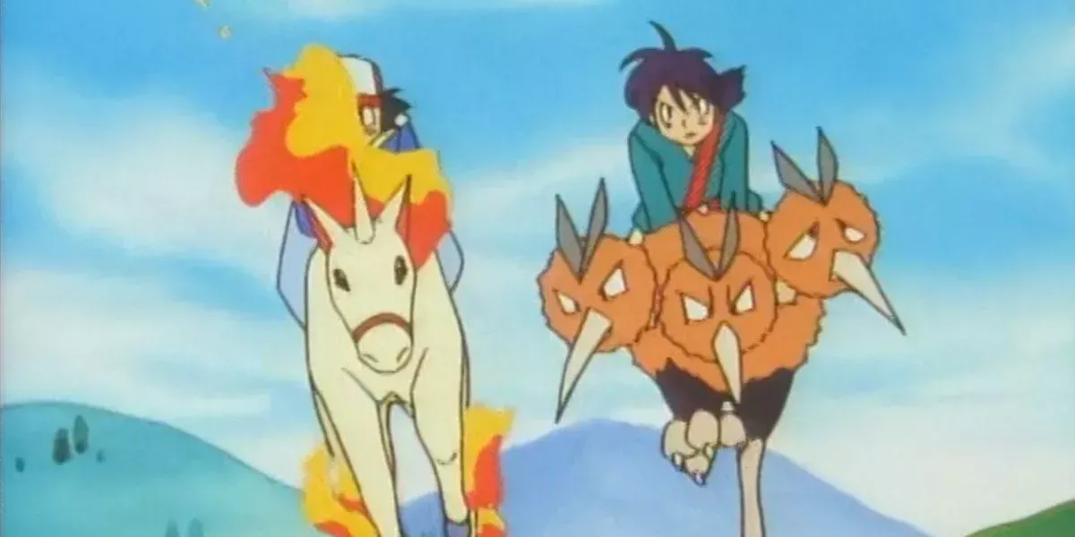 Ash y Ponyta están codo con codo con el rival de Lara, Darío, y su Dodrio, hasta el final, cuando Ponyta evoluciona a Rapidash, lo que le da un impulso extra de velocidad y les da la victoria.