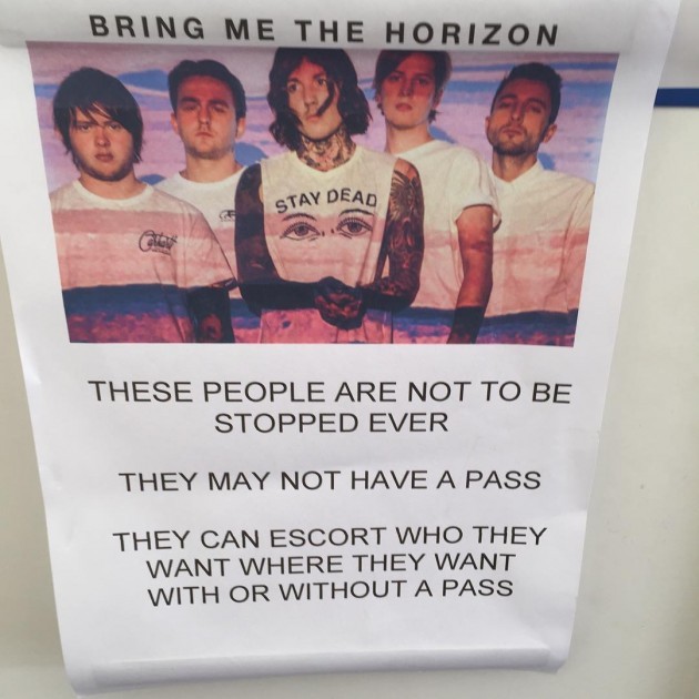 En dicho cartel, dirigido a los empleados del festival, se mostraba una imagen con los distintos miembros de Bring Me The Horizon donde se podía leer lo siguiente: “A esta gente no se la debe parar nunca. Quizá no lleven pase. Pueden ir con quien quieran a donde quieran, con o sin pase”. Por supuesto, esto no resultó del agrado de Brian Baker, el guitarrista de Bad Religion, quien comentó lo siguiente en su perfil de Instagram: “Voy a parar a esta gente cada vez que les vea hoy para decirles el asco que da su banda”.