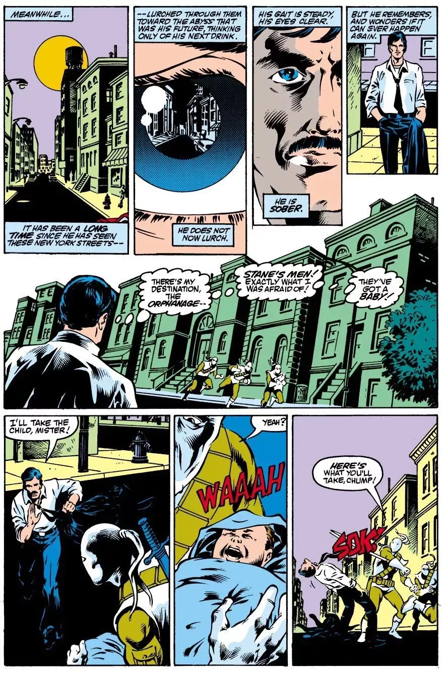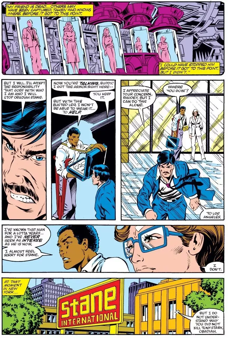 Sin embargo, justo cuando Tony tiene su vida en orden, Stane vuelve a atacar en Iron Man #199 (de O'Neil, Herb Trimpe, Ian Akin y Brian Garvey), secuestrando a los amigos y antiguos compañeros de trabajo de Tony, e incluso secuestra al bebé...
