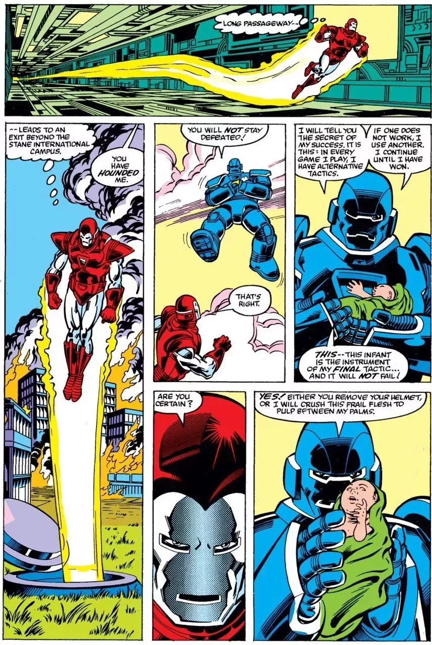 Tony, ahora de vuelta como Iron Man, luchó contra Obadiah Stane como Iron Monger, que tenía al bebé como rehén...