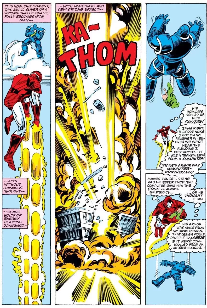 Pero aunque la armadura de Stane era avanzada, no sabía usarla como Tony sabía usar su armadura, así que Tony pudo derrotarlo y rescatar al bebé...