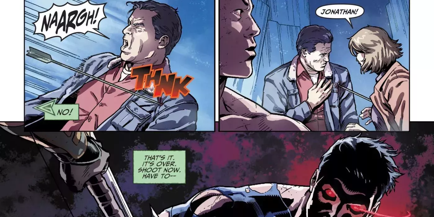 En el universo de Injustice, también de Tom Taylor, Green Arrow disparó accidentalmente a Jonathan Kent, el padre adoptivo de Superman, con una flecha que rebotó en Superman. La razón por la que disparó a su antiguo amigo fue porque Superman se estaba volviendo cada vez más tirano e incluso había desarrollado una forma de mejorar a sus soldados con la durabilidad kriptoniana, una ventaja que habría acabado con la creciente resistencia de Batman en sus inicios. Flecha Verde se infiltró en la Fortaleza de la Soledad para robar una muestra de la píldora milagrosa para ayudar a sus aliados. Por desgracia, Superman lo encontró.