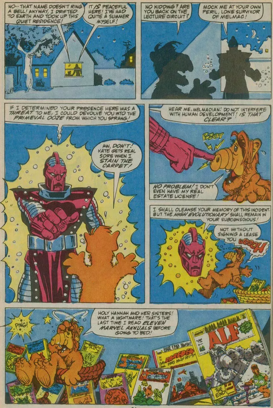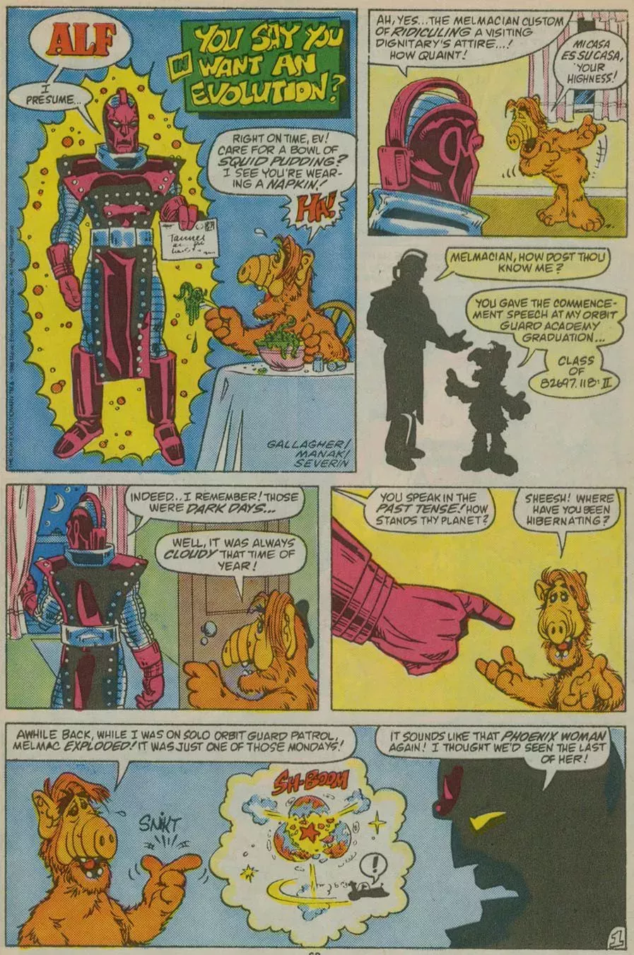 Más adelante en el anual, Alf vuelve a ser contactado por el Alto Evolucionador, ya que éste se interesa por la historia del planeta natal de ALF, Melmac, pero se entristece al saber que el planeta ha sido destruido (el Evolucionador asume automáticamente que fue Fénix Oscura quien lo destruyó)...