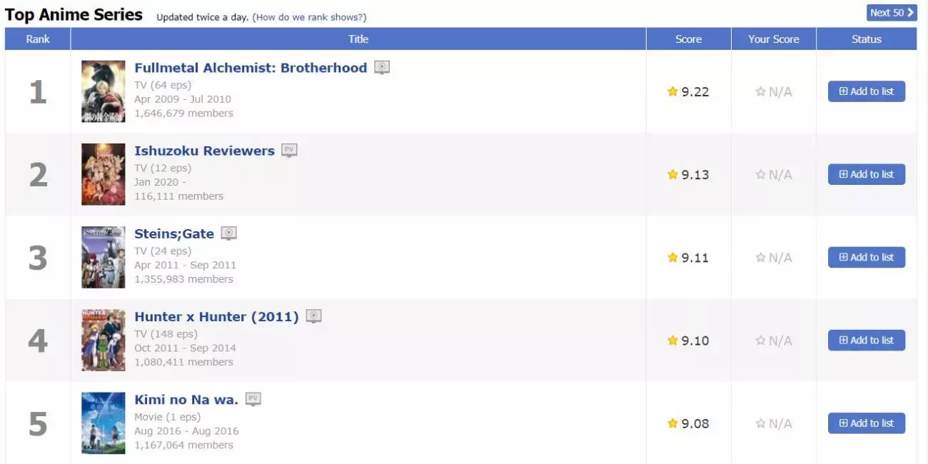 A muchos aficionados principiantes al anime les puede resultar difícil hacer un seguimiento de lo que han visto o encontrar nuevos programas que ver. Por suerte, existen sitios web para ello. El principal es MyAnimeList. MyAnimeList es una completa base de datos de anime y manga en la que los aficionados pueden clasificar (y puntuar) los programas que ven. Incluso hay gráficos para cada temporada de anime, para que los aficionados puedan ver qué se emitirá en las próximas temporadas y decidir qué ver.