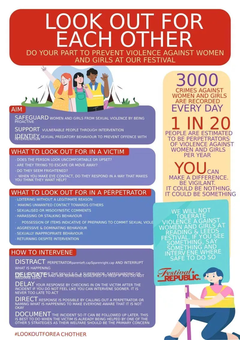 "Esté atento a nuestro #LookOutForEachother sobre el consentimiento y Brook la caridad de salud sexual y bienestar que distribuyen condones en el lugar y fomentan conversaciones sobre la importancia del consentimiento y el sexo seguro Visite las páginas de seguridad en nuestros sitios web para obtener información especÃfica sobre las ubicaciones de las instalaciones y las organizaciones a mano para ayudar: Seguridad en Reading y Seguridad en Leeds".