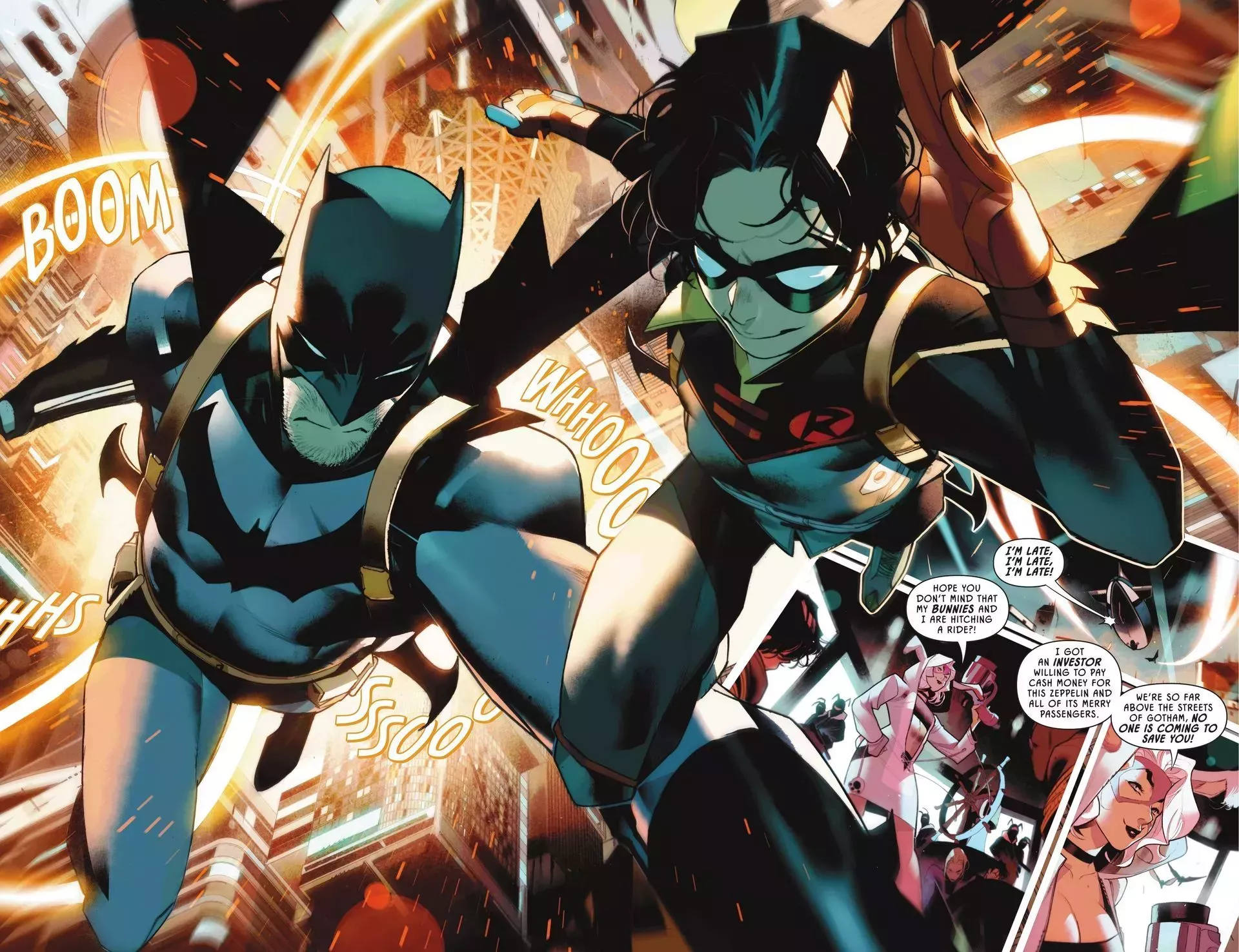 Puede que Catwoman se haya llevado a todos sus secuaces con ella, pero el crimen sigue haciendo de las suyas en Gotham City. Batman y Robin nº 1 comienza con una situación de rehenes en la que White Rabbit retiene a la gente a punta de pistola en un viaje en zepelÃn. Los dos luchadores contra el crimen no tardan en acabar con su enemigo y llegar a casa justo a tiempo para echarse una siesta. Al comenzar un nuevo dÃa, padre e hijo rememoran los viejos tiempos y encuentran nuevas formas de volver a conectar con el mundo. Con Damian habiendo hecho un gran avance en el caso de la noche anterior, Batman y Robin entran en acción sólo para encontrar a Killer Croc y Orca esperando su llegada.