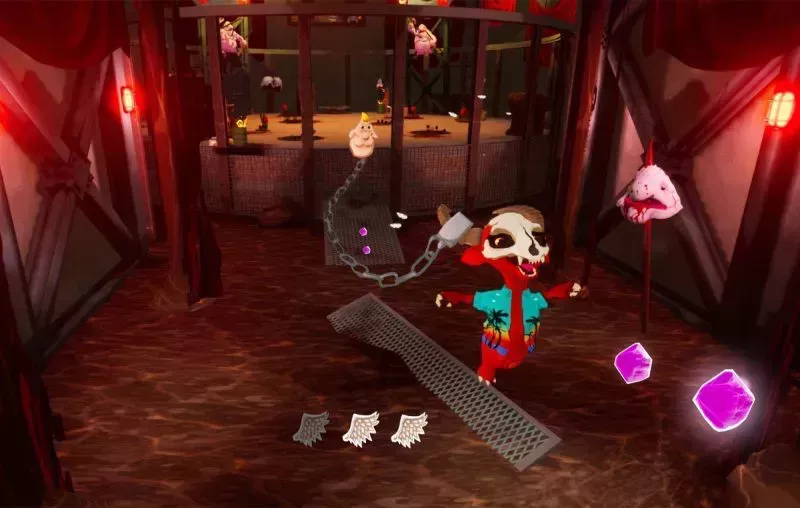 El objetivo final en Hell Pie es recoger ingredientes. Hay gemas desperdigadas por todas partes que puedes recoger, y que te permiten comprar trajes para vestir a Nate o a Nugget con distintos grados de absurdo, que van desde un mankini hasta un traje BDSM y una camisa hawaiana, pasando por todo lo demás. Cada uno de los cuatro mundos principales contiene tres niveles que esconden un ingrediente. La mayorÃa se basan en retos de plataformas, pero hay combates contra jefes, uno de los cuales me recuerda a Crash Bandicoot.