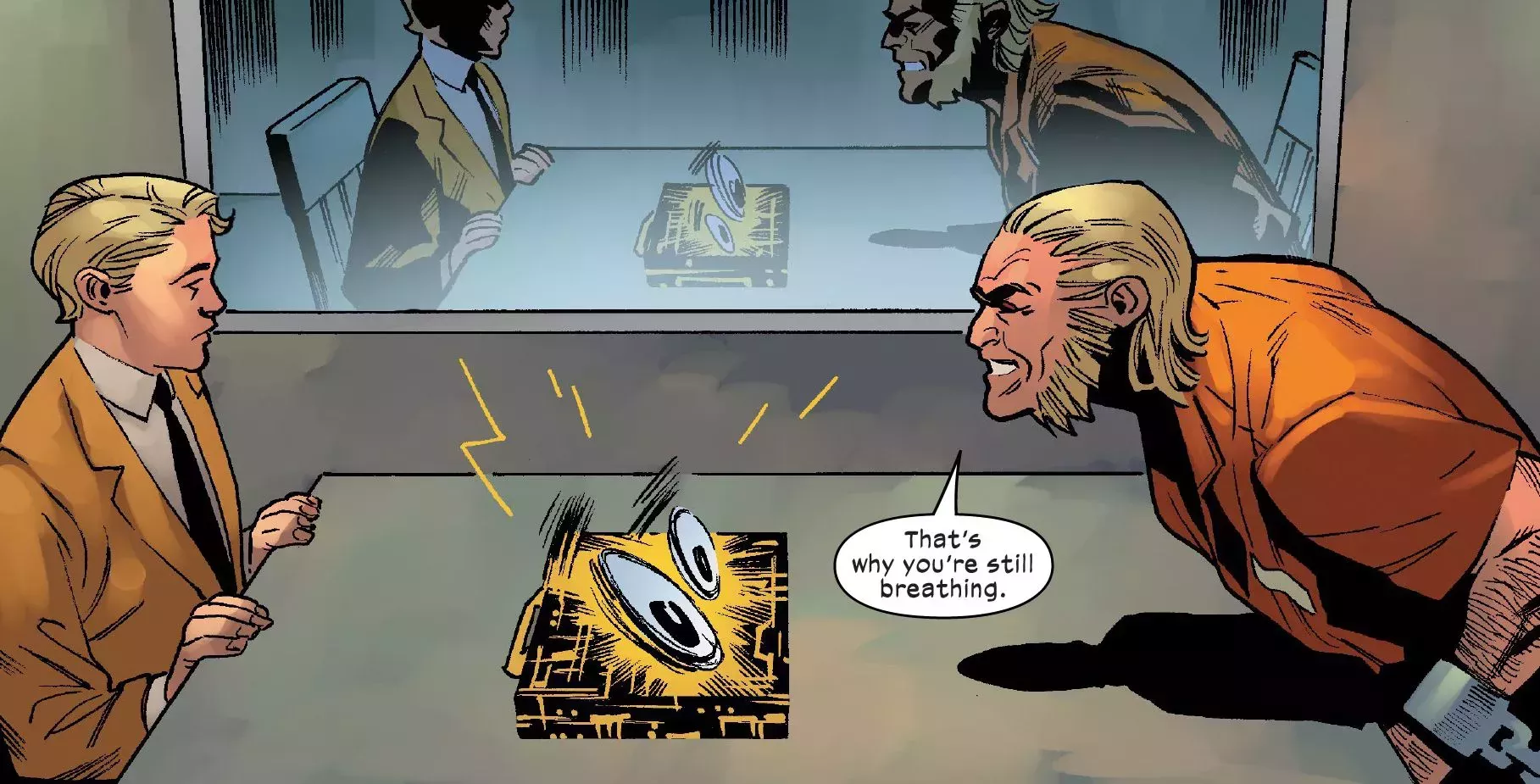 Los años de experiencia de LaValle como escritor de terror se aprovechan al máximo en Dientes de Sable nº 1. La matanza imaginaria de Dientes de Sable se vuelve cada vez más aterradora y extraña a medida que avanza. La naturaleza inquietante de la narración se hace más accesible y perturbadora gracias a la narración de Dientes de Sable. LaValle capta la voz ruda y ensimismada de Creed con tanta naturalidad que es difícil no sentir simpatía y empatía por el personaje, incluso cuando fantasea con atroces actos de violencia. Bajo todo el horror, LaValle está tejiendo un fascinante misterio sobre la verdadera naturaleza de la situación de Dientes de Sable en Krakoa. Al final de este primer número, empieza a parecer que el trato que hizo con Doug es más importante de lo que pensaba inicialmente.