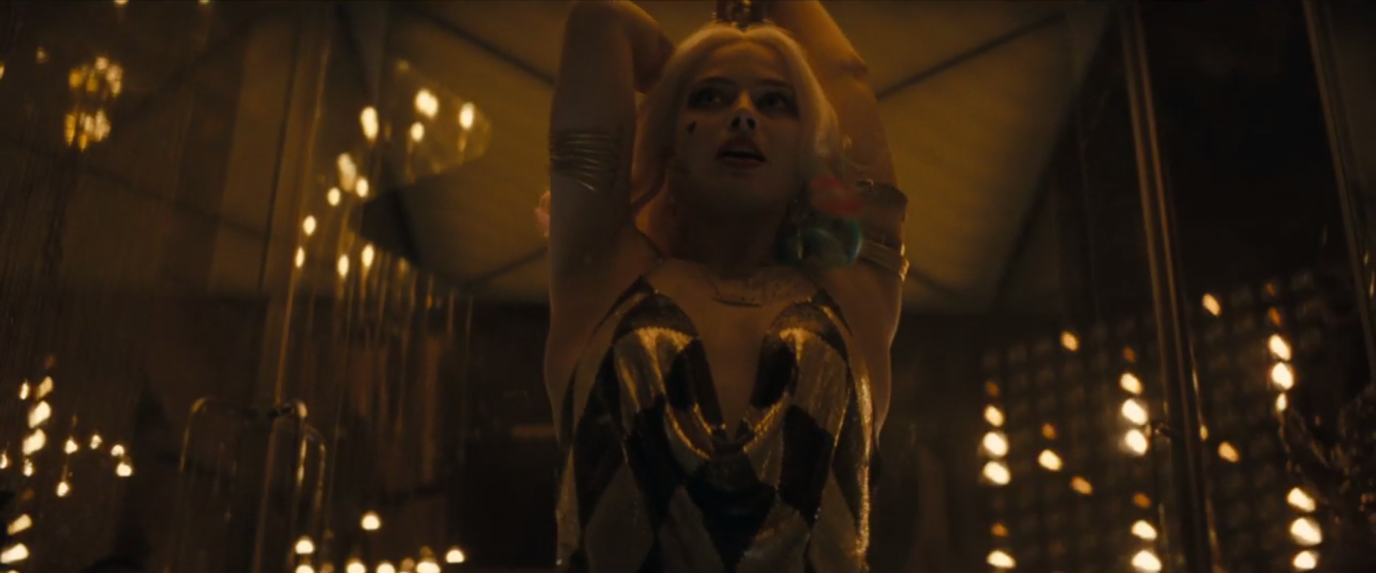 El Payaso del Crimen regenta un club nocturno desde donde dirige los distintos negocios que lleva a cabo con su banda de criminales. En este local, hay una escena donde se nos muestra a Harley Quinn bailando de manera sugerente con un vestido dorado particularmente corto.