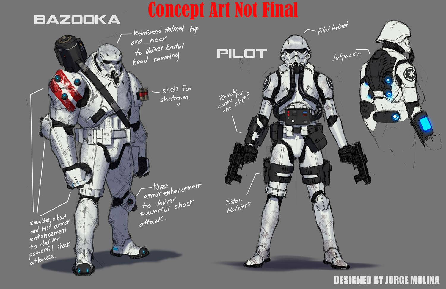 Abordando los motivos de su lealtad al Imperio, así como las diferentes dudas y desconfianzas que hay dentro de sus propias filas, los diseños de los nuevos Stormtroopers de élite de Star Wars realizados por el dibujante mexicano Jorge Molina nos presenta además diferentes grados des especialización dentro del cuerpo, recordando en parte a la mítica saga de videojuegos Commandos: Más allá de la línea enemiga.