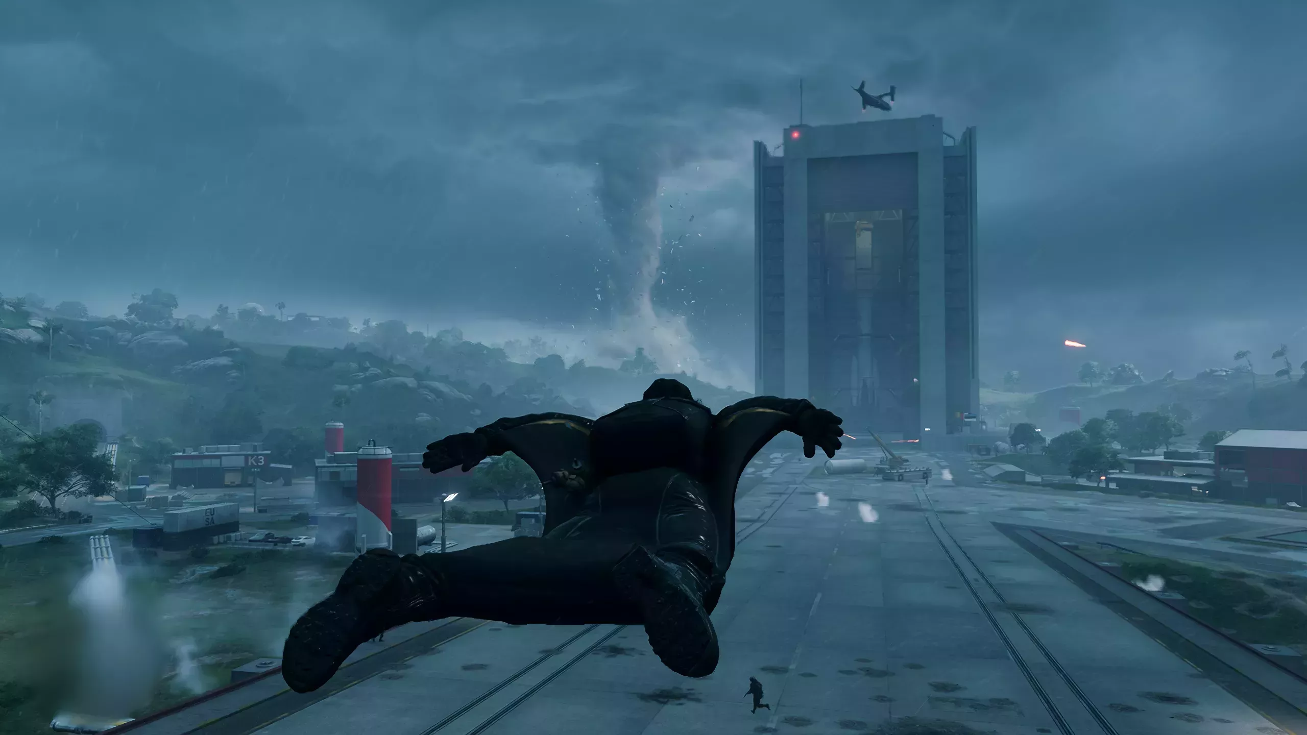 No estaba seguro de si los tornados de Battlefield 2042, que aparecen aleatoriamente, podían recoger vehículos hasta que el ATV de mi escuadrón fue inhalado por uno. Mientras caíamos hacia el cielo, tuve que tomar una decisión: ¿Sobrellevar la situación en el asiento del artillero o eyectarme? Me eché. Nuestro conductor permaneció al volante, confiando en que el "todo terreno" incluía el cielo. Dos segundos después, el vehículo cayó en un campo como una bomba y lo incineró.