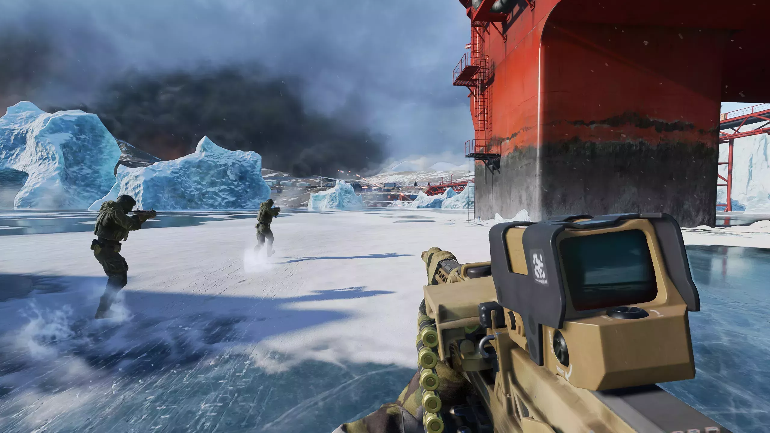 Y sin embargo, el mundo de 2042 tiene toda la presencia de un flotador ocular. La mayor parte del tiempo me olvido de que hay una guerra ficticia, y entonces una voz rusa menciona el imperialismo occidental y se centra brevemente en el tema. Lo esencial es que somos "No-Pats", una palabra inventada para designar a los mercenarios sin Estado que luchan por los Estados Unidos y Rusia en una serie de puntos conflictivos del cambio climático. Un mapa es mitad desierto y mitad agricultura, dividido en el medio por un muro, otro tiene lugar alrededor de una plataforma petrolífera de la Antártida.