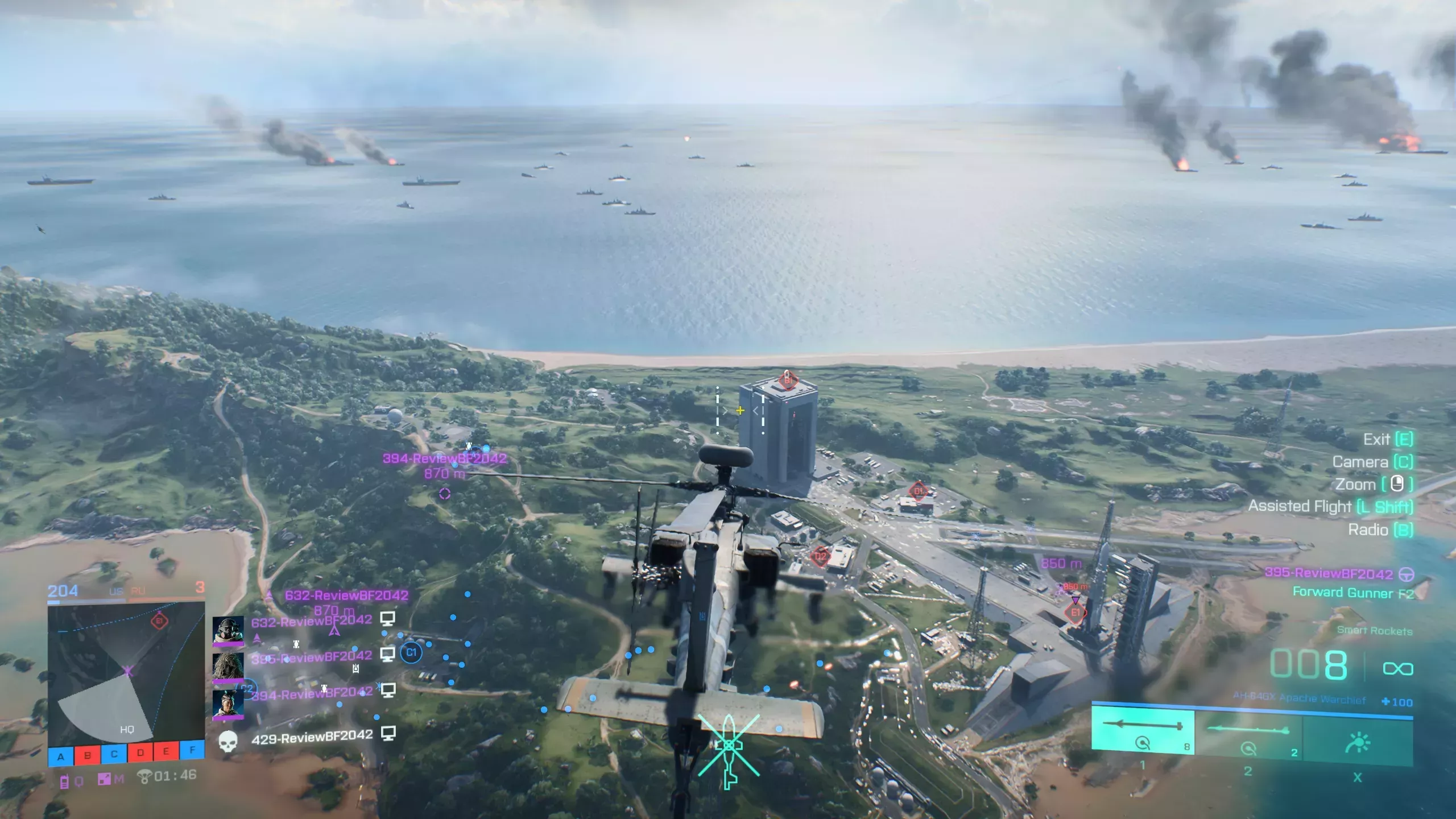 Las pequeñas decepciones de Battlefield 2042 se acumulan. Por ejemplo, no hay chat de texto entre equipos. Solo he usado /all para decir "lol" después de que las aspas de mi helicóptero se enredaran con las de un oponente, pero reconocer esos momentos compartidos es parte de la diversión. La inclinación manual de Battlefield 5 ha desaparecido, lo que se siente como la pérdida de un par de grupos musculares importantes después de haberse acostumbrado a moverse en Rainbow Six Siege durante los últimos años. Hay errores divertidos, como que los aerodeslizadores puedan subir por superficies verticales, pero también hay errores irritantes, como que la reanimación a veces no funcione. No hay página de estadísticas en el menú, lo cual es una omisión sorprendente. Espero que los desarrolladores tomen ejemplo de Naraka: Bladepoint y nos proporcionen las estadísticas innecesariamente granulares que tanto deseamos (ese juego incluso muestra cómo te posicionas junto a los jugadores de tu ciudad, lo cual es genial).