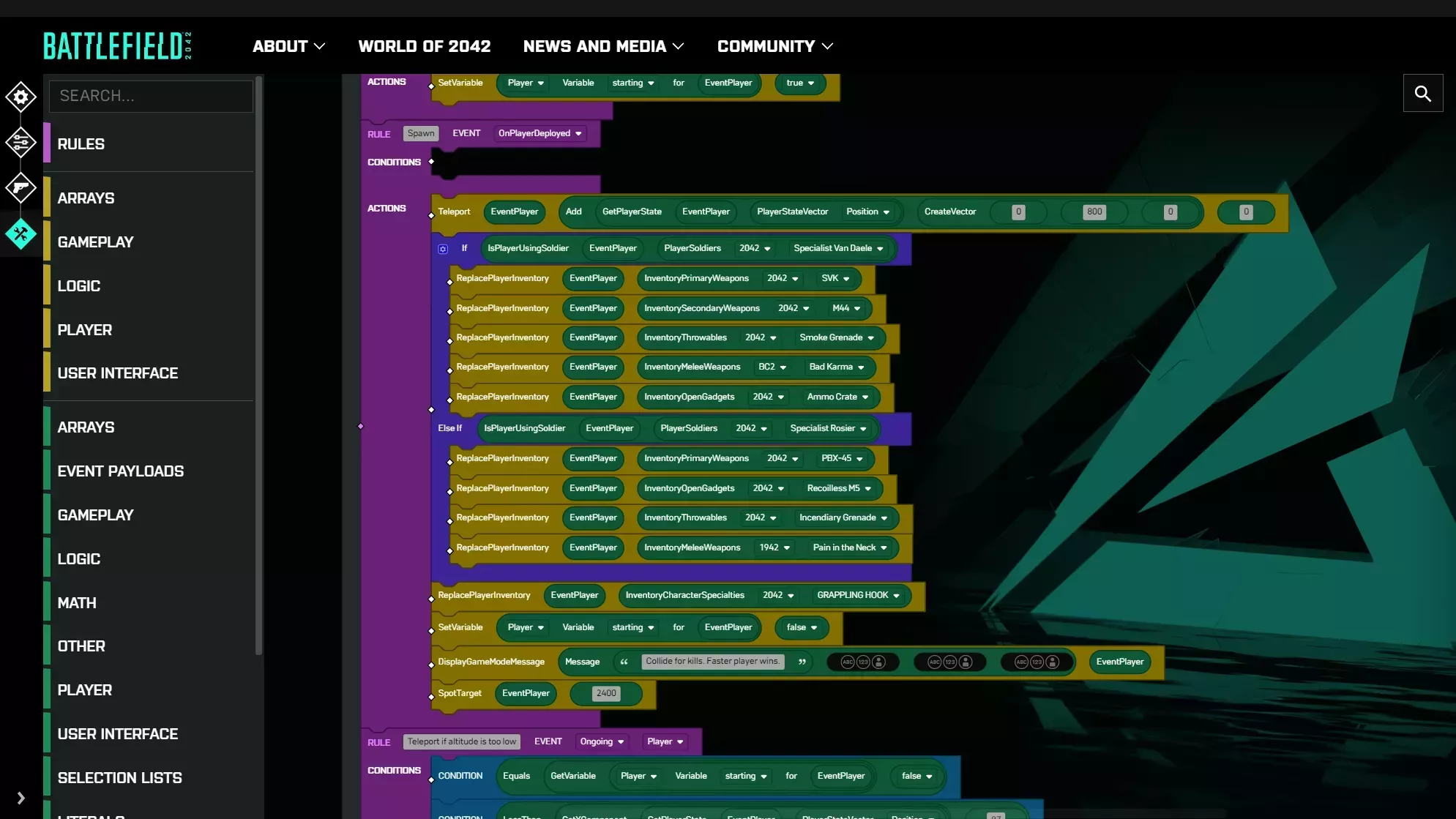 Me frustran las restricciones de Portal que parecen innecesarias, o como si existieran para impedirme hacer un modo que no sea divertido. Yo decido dónde están los límites del diseño de FPS, muchas gracias. La física no se puede ajustar, por ejemplo, a menos que cuente el multiplicador de daño por caída. No puedes dar a un equipo soldados de Battlefield 1942 pero dejarles seleccionar las armas de otro juego, sin ninguna buena razón que pueda identificar. El editor de lógica visual, que abre muchas más posibilidades que los botones y controles deslizantes incorporados, sólo puede utilizarse para modificar los modos "todos contra todos" y "deathmatch" por equipos, que no contienen vehículos. No se puede configurar un modo que, por ejemplo, ponga a 10 jugadores en jets para un combate a cara descubierta.
