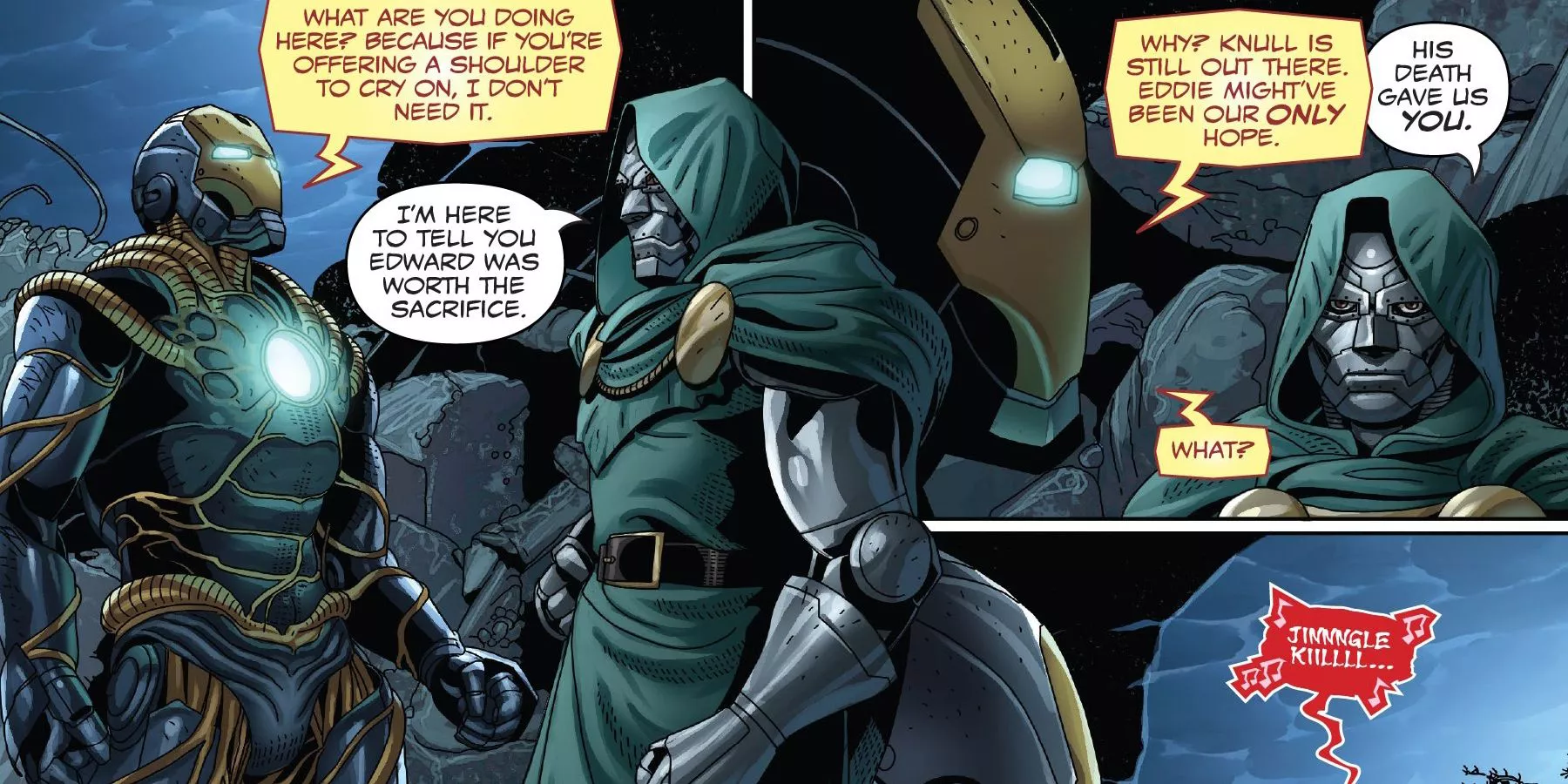 Impresionado por la exhibición de Tony, Doom le dice que su traje negó la asimilación de Dunwoody en el vacío de Knull y que el poder podría ser extrapolado para luchar contra el Rey de Negro. Tony se da cuenta de que Doom quiere llevarse el traje para él, así que en su lugar utiliza la idea del villano como punto de partida para sus propios planes.