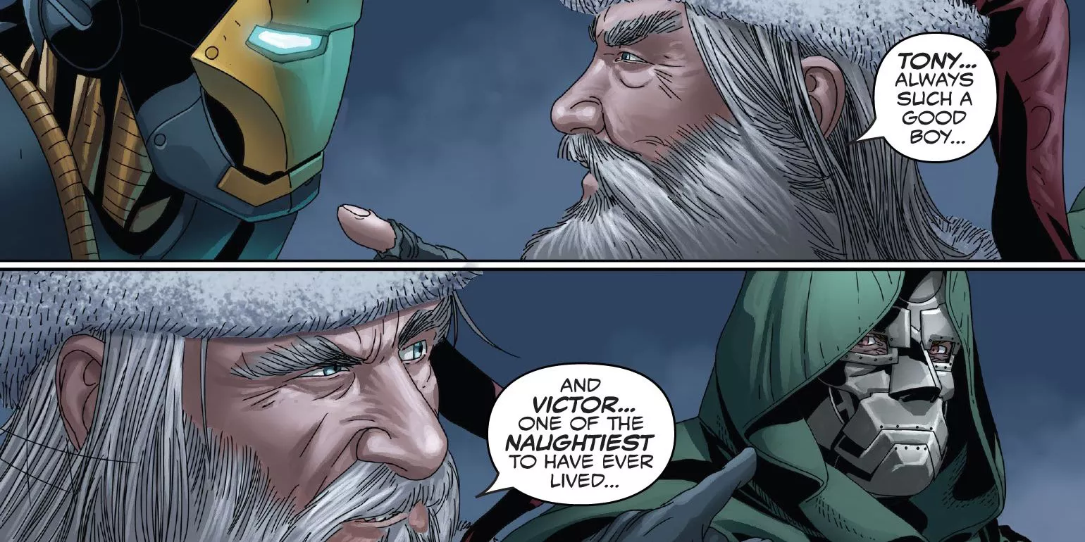 Mientras se preparan para separarse, la conversación vuelve a su encuentro de Navidad. Doom intenta justificar cómo Dunwoody sabría de él y Tony, pero el héroe señala que ninguno de ellos tiene identidades secretas y sus hazañas son bien conocidas. A pesar de la lógica de Iron Man, Doom aún quiere creer que tal vez conocieron al verdadero hombre del traje rojo.