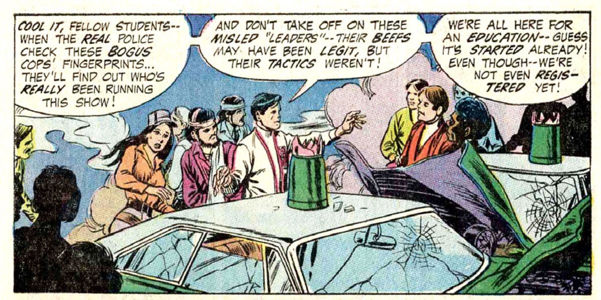 Una de las primeras misiones de Dick Grayson cuando se fue en solitario consistió en detener un plan de algunos falsos hippies/peaceos para protestar y luego cerrar la Universidad de Hudson.