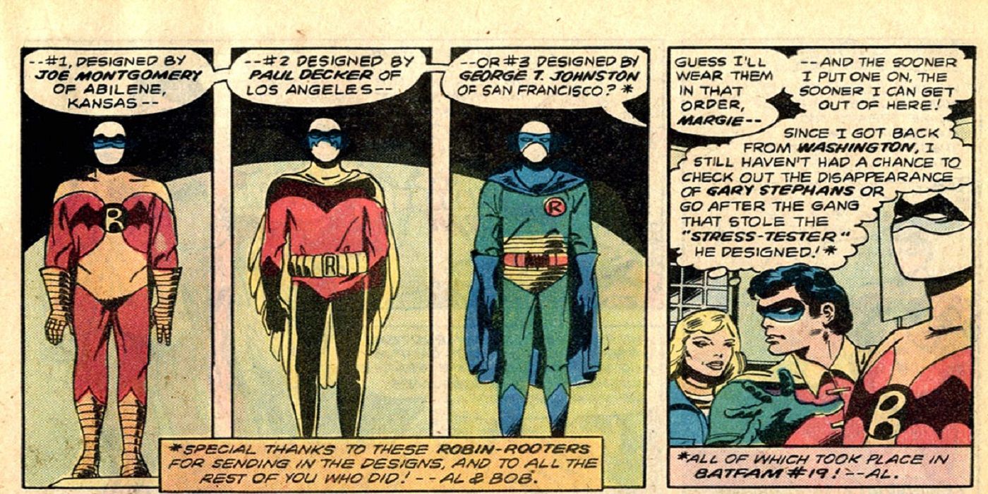 Cuando Robin regresó en Detective Comics #481, el libro tenía 100 páginas e incluía gran parte de la Bat-Familia, una de las primeras historias mostraba que a Robin le ofrecían un puñado de trajes nuevos. Cada uno tenía un aspecto muy diferente, y todos tenían pantalones, y fueron diseñados por lectores leales que enviaron por correo sugerencias de disfraces.