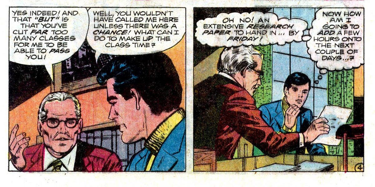 El tiempo de Dick Grayson en la universidad llegó a su fin con Detective Comics #495. Entre ser periodista y superhéroe, el tiempo de Dick en la escuela fue limitado. Constantemente se saltaba las clases, y terminaba diciéndole que la única forma de triunfar en la escuela era presentando una tonelada de trabajo de una sola vez.