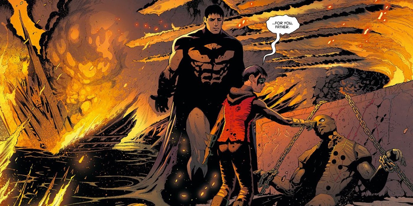 En Batman y Robin Vol. 2 #1, de Peter Tomasi y Patrick Gleason, Bruce saca a Damian como Robin, y Robin casi deja que un vehÃculo que lleva combustible irradiado explote porque no le importan los hombres con los que están luchando. Bruce tiene que sermonearlo sobre el valor de la vida humana y la importancia del control para una figura como Robin; esto es importante, ya que Robin quiere hacer cosas como decapitar al Espectro, visto arriba.