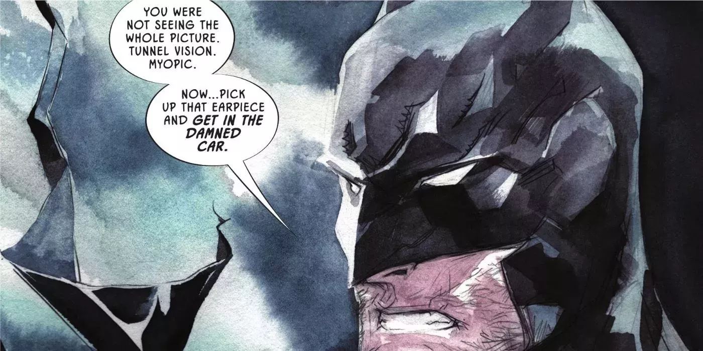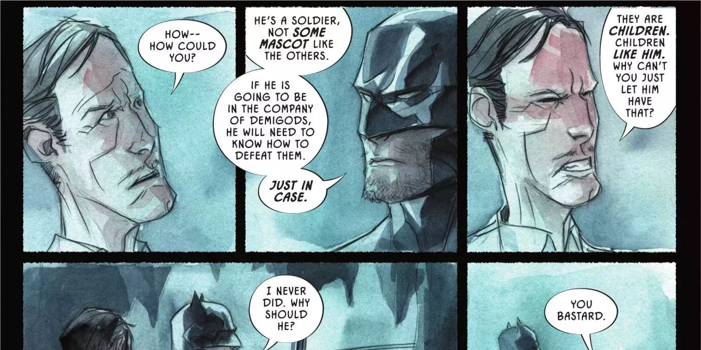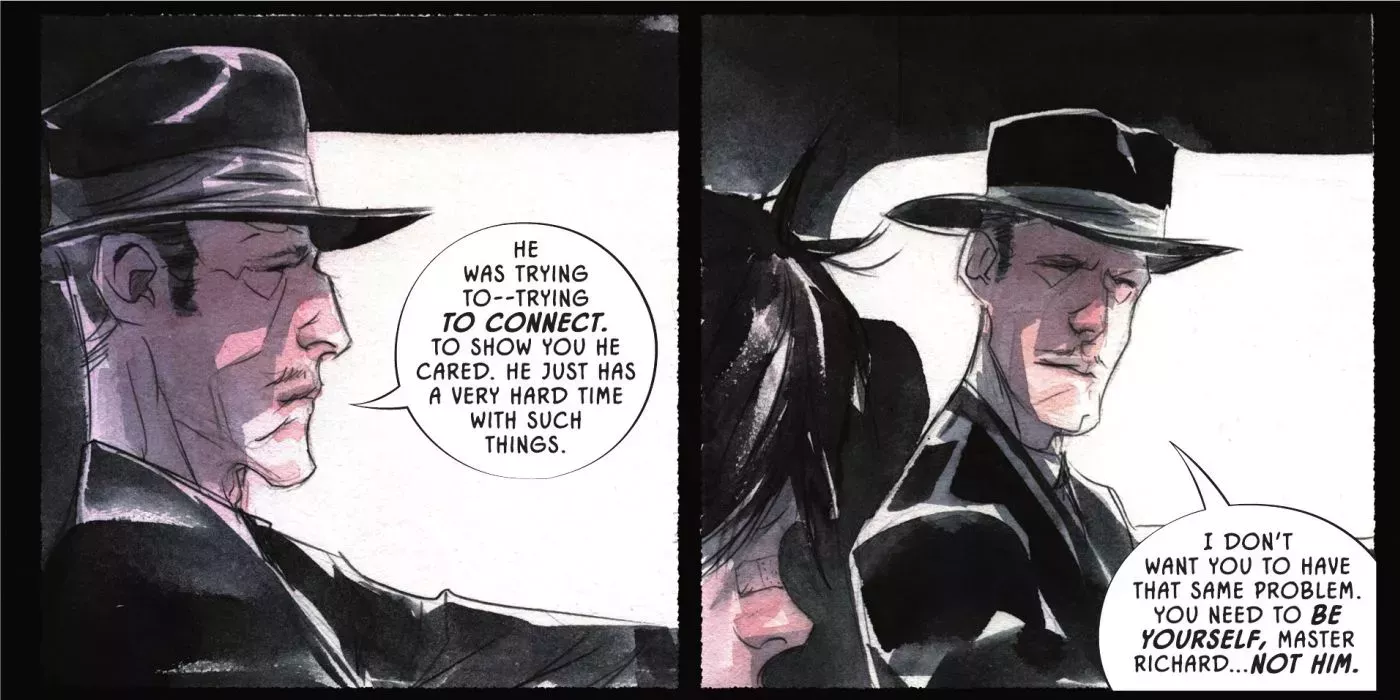 Grayson ha encontrado por fin a otros como él; gente con la que puede compartir sus experiencias y que entenderá todo lo que está pasando. Ver que todo era una treta y una forma de que Batman reuniera información para su base de datos hace que esta escena sea realmente horrible. Se hace aún más conmovedora después de que Alfred lo descubra y arremeta contra Bruce, regañándolo por sus acciones.