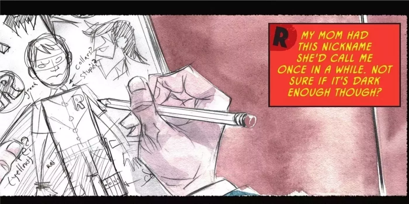 Aunque Robin y Batman es una historia sobre la transformación de Dick en Robin, también trata de cómo Bruce aprende a ser mejor padre y mentor de su hijo adoptivo. Este elemento se muestra a la perfección cuando, en un intento de disculparse por haber dejado a Robin en el banquillo, Bruce revela que ha hecho crear los diseños de los trajes de Dick para él. El único problema es que los diseños de Dick estaban guardados en su diario privado, escondidos de las miradas indiscretas de Batman.