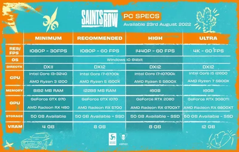 En la página web de Saints Row se han publicado los requisitos mÃnimos, recomendados, de configuración alta y ultra, lo que permitirá a los jugadores prepararse para cuando el juego salga a la venta la próxima semana (23 de agosto). Puedes verlos en la siguiente imagen:
