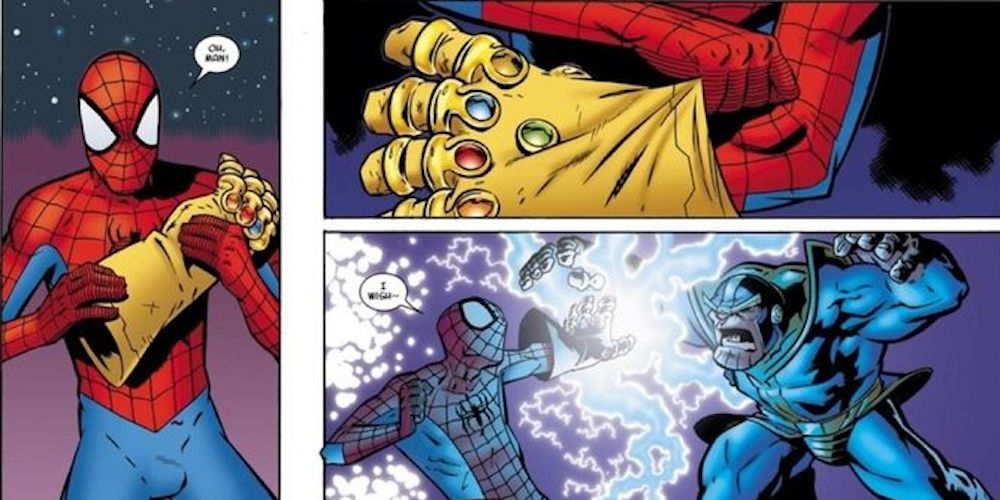 Los fans del universo cinematográfico de Marvel pudieron ver a Spider-Man acercarse al guante infinito de los Vengadores : Guerra del infinito, pero los cómics permiten a Peter Parker estafar al poderoso guante y avergonzar a Thanos. Vengadores y el guante infinito cuenta una entretenida historia que vuelve a poner a Thanos en apuros. Un equipo único entre Spiderman, Ms. Marvel y Wolverine resulta en que Spiderman obtiene inesperadamente el guante, el cual utiliza para desear que Thanos nunca lo tuviera, lo cual es un uso increíblemente diplomático de sus poderes.