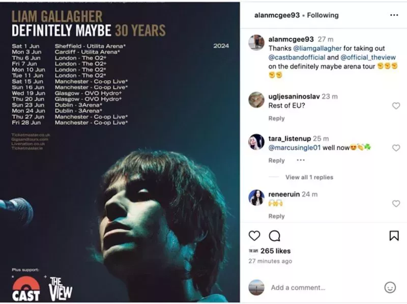 "Gracias @Liamgallagher por sacar a @castbandofficial y @official_theview en la gira definitivamente tal vez arena", escribió en el pie de foto, compartiendo un cartel actualizado de la gira con detalles de apoyo.