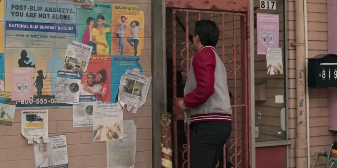 Mucho más difícil de ver que el cartel es un folleto de otra empresa post-blip: las citas. Se puede ver brevemente un folleto de "BlipSync", pero la imagen no ofrece mucho contexto. Un periodista preguntó directamente a los guionistas de la película.