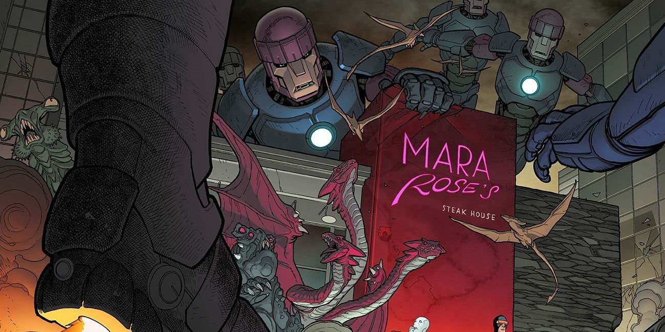 Cho dibujó a Iron Man durante su época en Los poderosos Vengadores, cuando el personaje básicamente dirigÃa el Universo Marvel después de la Guerra Civil. Cho dibujó al Hombre de Hierro en lo que se ha convertido en uno de sus iconos, la armadura del Extremis, y lo sacó del parque.