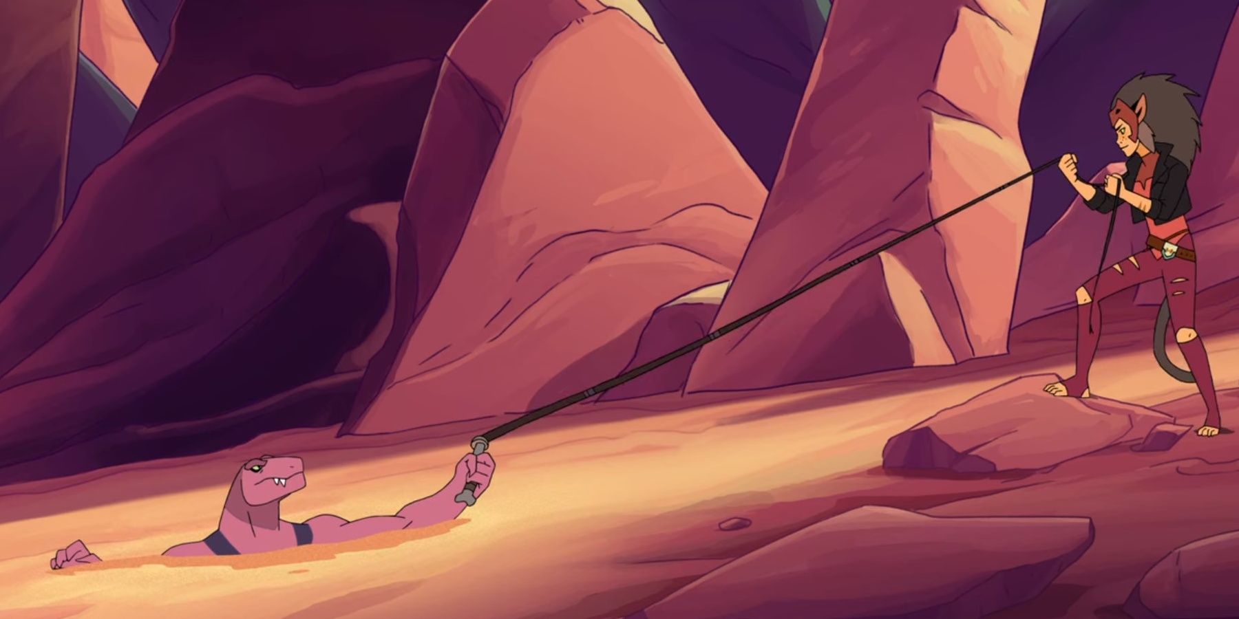 Pero cuando Catra entra en los residuos, se deleita en el caos desenfrenado. Cuando un matón bárbaro intenta matarla, ella lo derrota en combate, quitándole el látigo. Luego, deja que se ahogue en arenas movedizas.