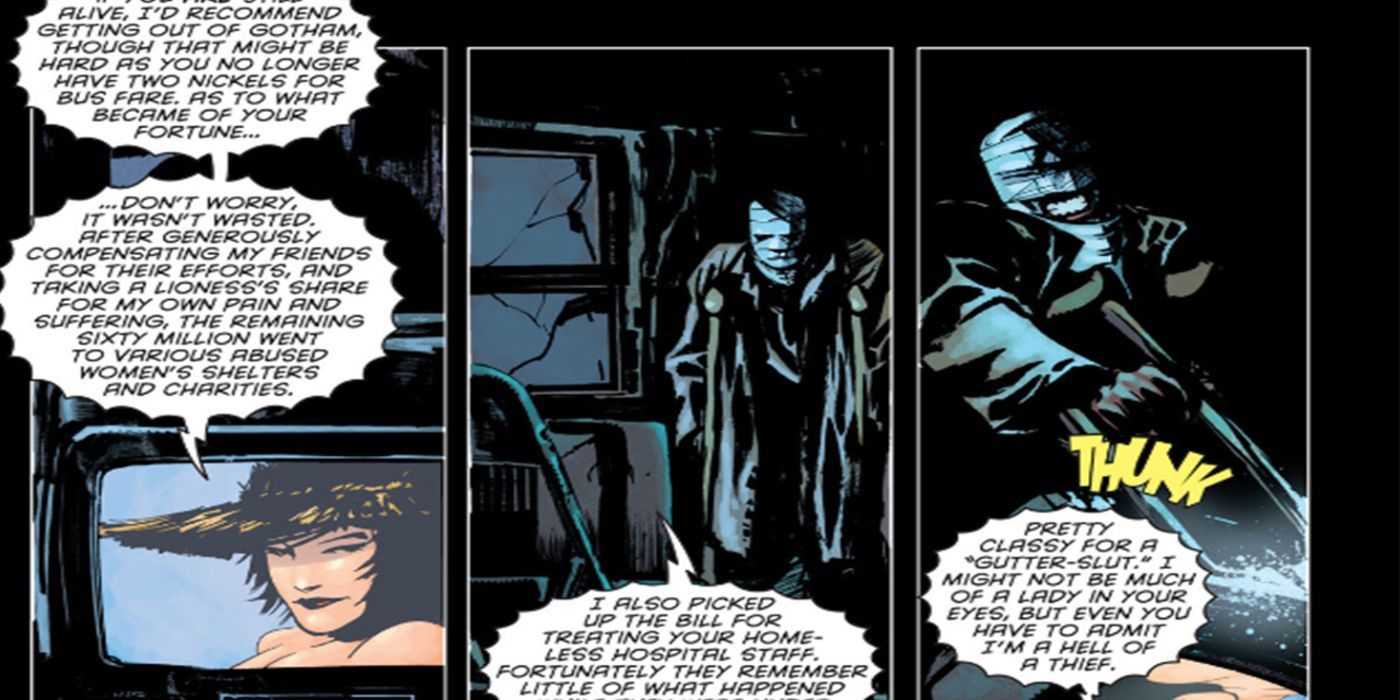 Sin embargo, no se guardó toda esa riqueza para sí misma, ya que envió una parte considerable a organizaciones benéficas y a aquellos que necesitaban ayuda monetaria. Ella sabe, por medio de Batman, lo obsesionado que está con el dinero. Y sabe que esta es la forma perfecta de venganza por lo que él le hizo.