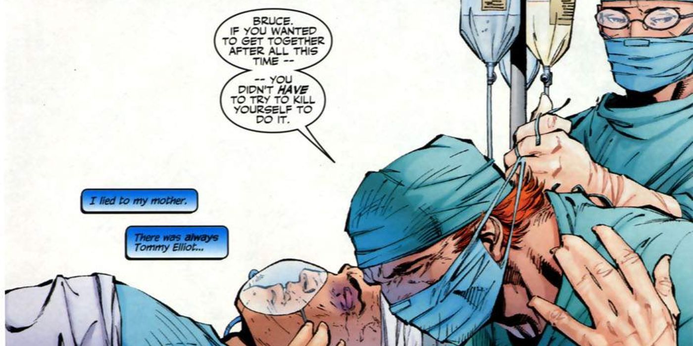 Hay un montón de arenques rojos que llevan a este momento. Desde Harvey Dent a Clayface y Jason Todd, hay bastantes personas que parecen tener el potencial para ser el hombre detrás de las vendas. Al final, sin embargo, resulta que el villano es alguien nuevo, pero viejo. Un hombre que Bruce conoce desde hace mucho tiempo: Su amigo de la infancia, Tommy Elliot.