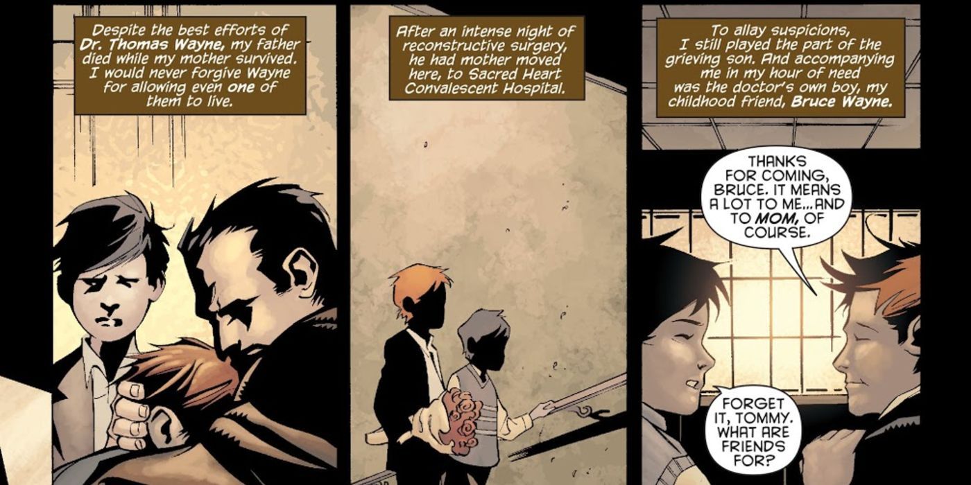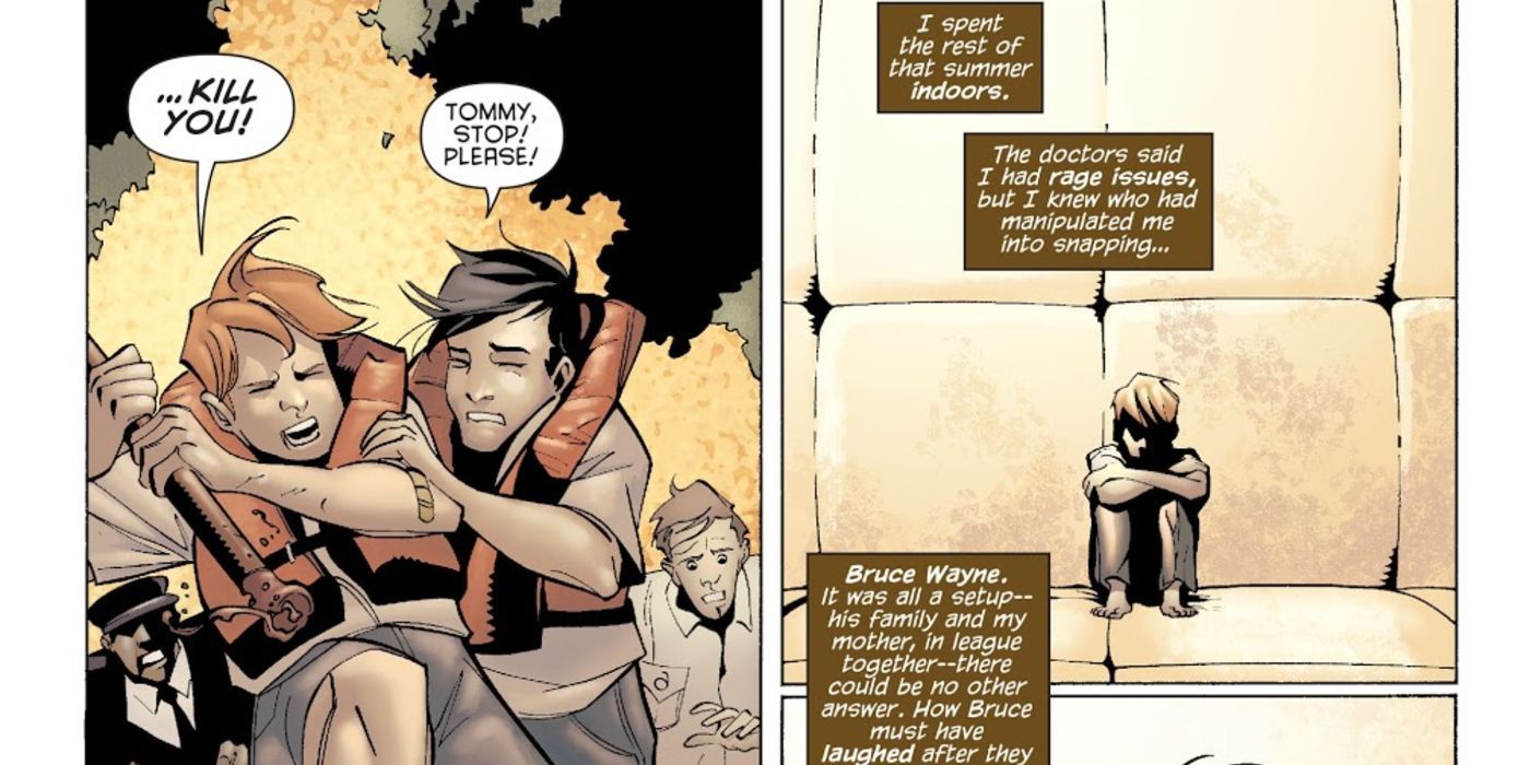 En un campamento después de la muerte de su padre y la hospitalización de su madre, Tommy pasa algún tiempo con su mejor amigo Bruce. Le cuenta al joven Batman lo abusivo que había sido su padre y lo calculadora y astuta que ha sido la reacción de su madre ante todo esto. Pero justo cuando comienza a establecerse lejos del control paterno, la madre de Tommy llega para llevárselo. Molesto por su apariencia, y enojado cuando un niño se burla de él, deja salir su lado violento y hace una escena en el campamento.