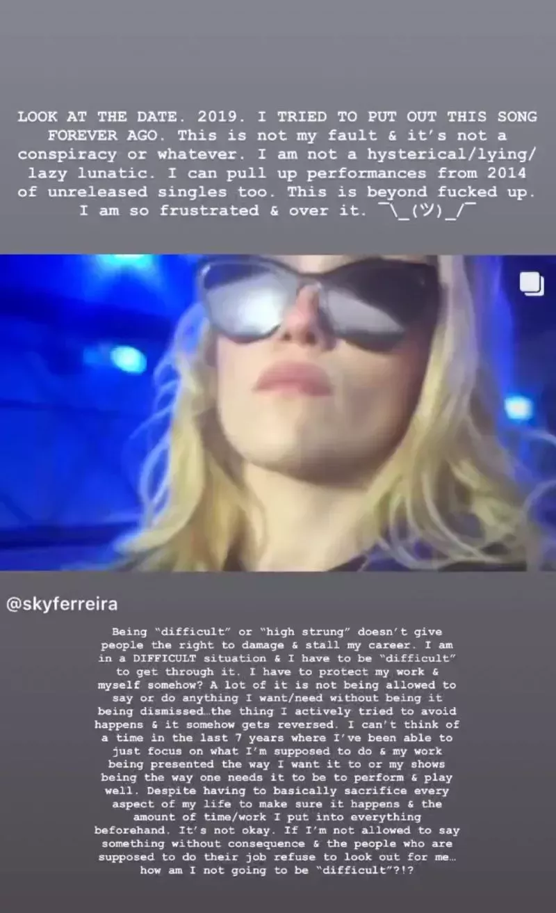 Sky Ferreira ha tomado Instagram para hablar de las luchas que está enfrentando con la publicación de nueva música y su reputación como un artista "difícil".