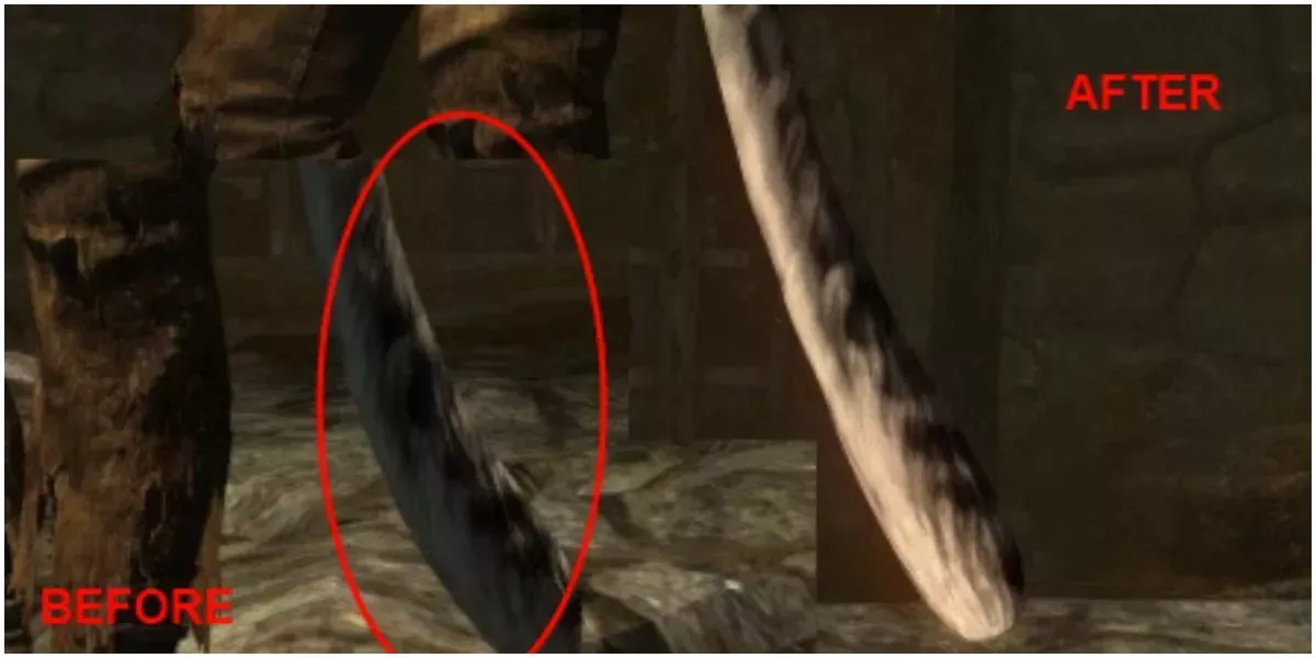 Al principio, las colas de los khajiits parecÃan estar puestas al revés, y el mod para arreglar la iluminación de las colas de los khajiits, de Wolf of the azar, es un regalo del cielo. Se vuelve excepcionalmente evidente cuando el jugador se despoja de su armadura como Khajiit o tiene instalado otro mod visual que afecta a los Khajiits.
