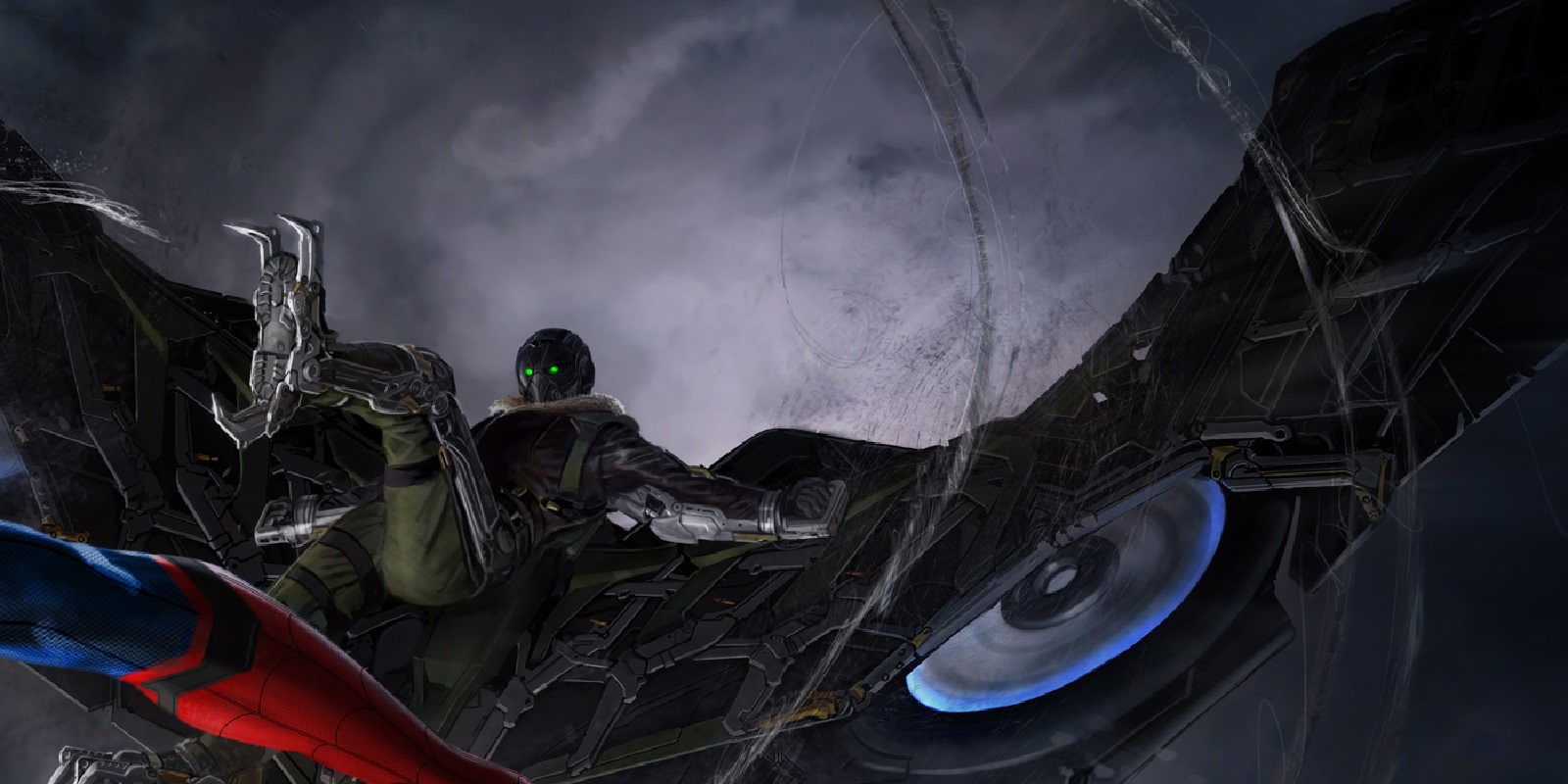 En estos diseños, que sirvieron para ofrecer una primera aproximación del Buitre que interpretará Michael Keaton en la película, podíamos ver el diseño de las alas del villano, basado en la más alta tecnología y con unas enormes turbinas circulares que parecían evocar unas alas diseñadas que fueron diseñadas para el personaje en su versión de la línea editorial Ultimate de Marvel Comics, pero que eran robadas y usadas por otro; el Merodeador (Prowler).