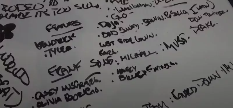 En una escena del documental se ve una pizarra en la que aparecen Doja Cat, Drake, Finneas, Frank Ocean, Bad Bunny, Billie Eilish, Halsey, Harry Styles y Kacey Musgraves.