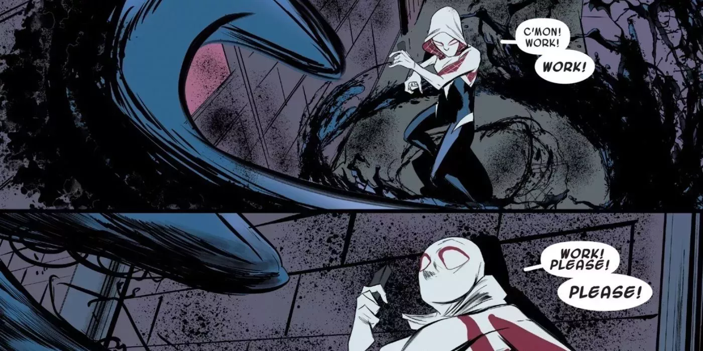 Gwen ha demostrado su capacidad para controlar algunos de los rasgos más malévolos de Venom. Sin embargo, no siempre ha sido asÃ. Cuando Spider-Woman perdió inicialmente sus poderes, se sintió abatida. Gwen intentó todas las formas imaginables de recuperar sus habilidades, incluso recurriendo a quienes acabaron traicionándola, una traición que desencadenó su vÃnculo inicial con Venom.