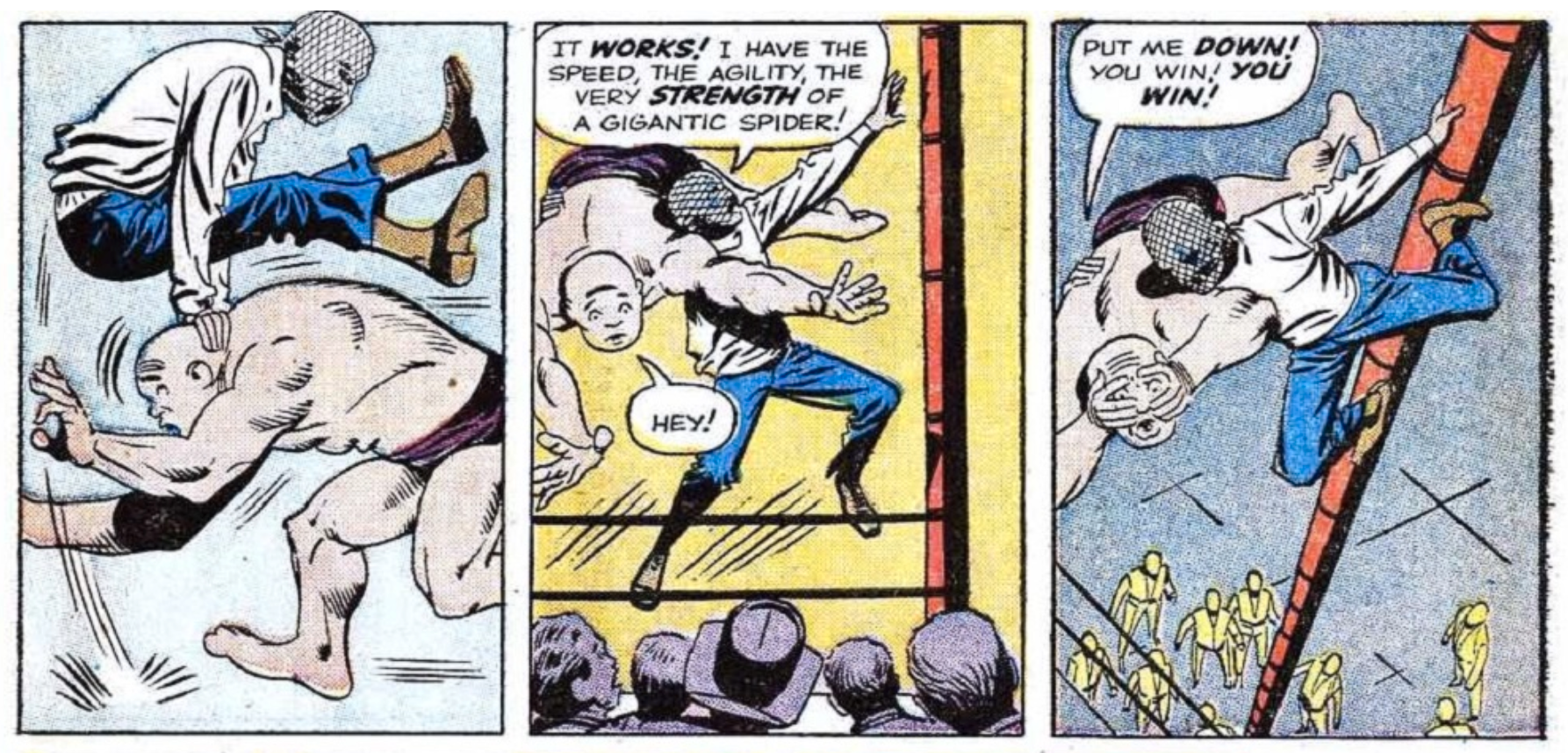 Peter Parker -recién dotado de sus poderes arácnidos- le toma la palabra. Se pone una máscara rápidamente para ocultar su identidad y se lanza a por la victoria. Es un experimento para Peter; sin conocer la profundidad de su fuerza o sus poderes, se enfrenta a Hogan para averiguarlo, y le da una paliza a Hogan y lo humilla en el proceso.