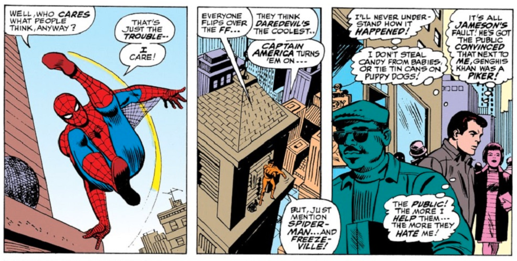 En Amazing Spider-Man #50 (Stan Lee y John Romita), Peter deja de ser Spiderman por el odio abrumador que recibe de la comunidad. Llega a tirar su traje a la basura y un niño lo encuentra, llevándoselo a J. Jonah Jameson y éste lo guarda en su despacho.
