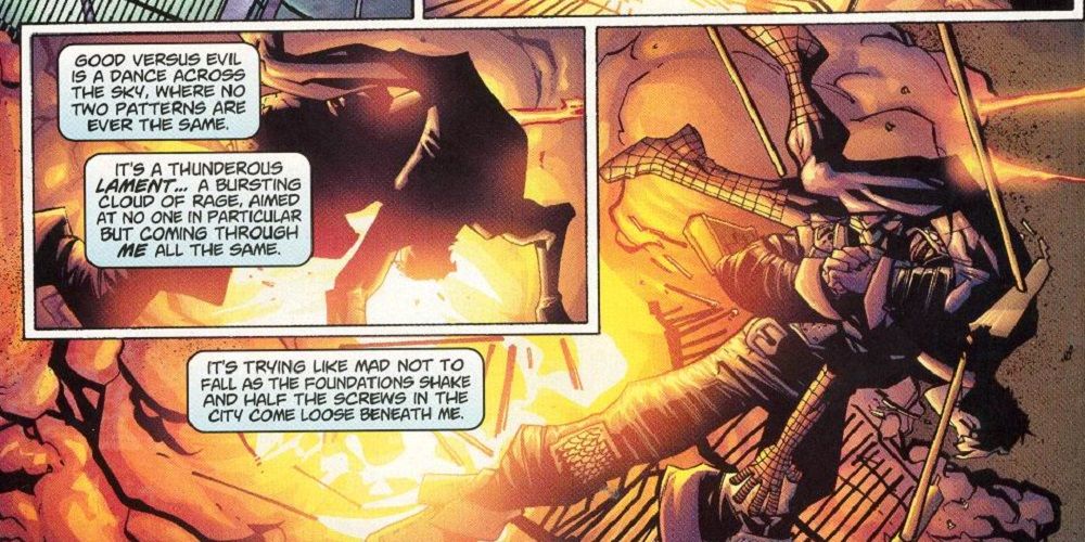 Está cansado, mental, emocional y físicamente, y por un momento parece que va a darse por vencido. Pero no lo hace; los espíritus de su tío Ben y su tía May aparecen, y consigue liberarse de la aplastante pila de metal. Fue un momento enormemente importante. Sin embargo, después de ese momento, aprendió sin duda que no es un desertor y lucha hasta el final y más allá.