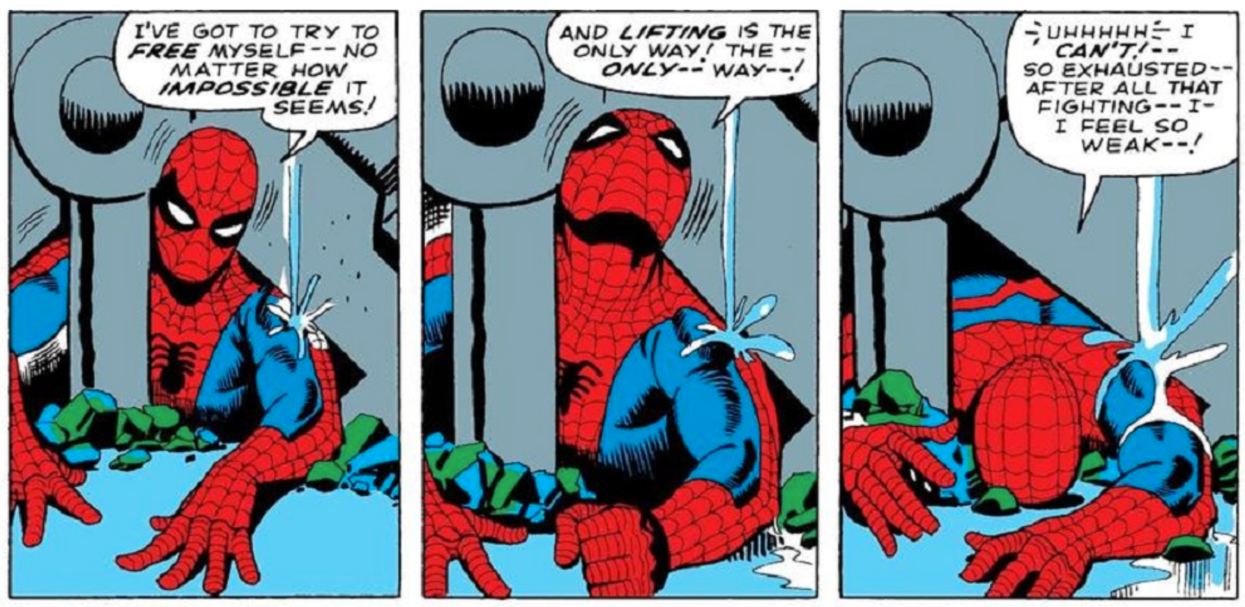 En The Amazing Spider-Man #31-33 (Steve Ditko y Stan Lee), Spider-Man acaba de experimentar una aplastante derrota en un combate cuerpo a cuerpo con el Doctor Octopus. Se encuentra atrapado bajo toneladas de metal industrial, y mientras está atrapado allí su esperanza de salir con vida empieza a caer en picado rápidamente.