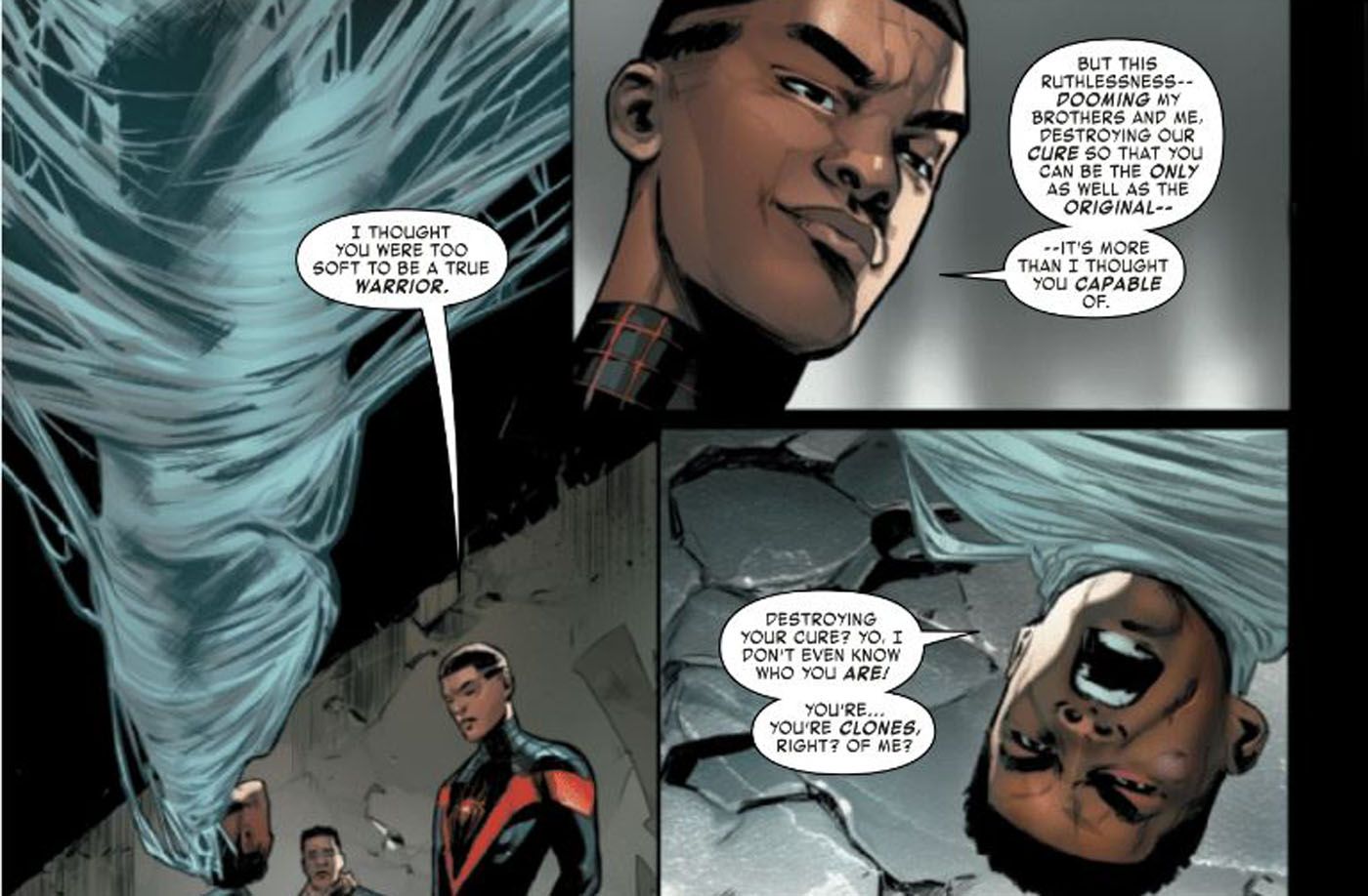 En el último número de Miles Morales: Spider-Man, Miles encontró la base de operaciones de sus clones y vio viales y experimentos por toda la habitación. Creyendo que eran formas de reproducción de los clones, Miles lo destruyó todo, sin darse cuenta de que el suero de los viales era necesario para mantener vivos a sus duplicados.